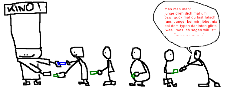 Kongo bongo: eine gute Einleitung für dieses Kreuzfurzrätsel. man sieht die leute die eine kinokarte kaufen wollen. einer in der schlange hat wohl nicht so recht kapiert wos lang geht. der mann hinter ihm möchte ihm klarmachen dass er so nicht weit kommt. er sagt es auf viele arten und weisen. Wie könnte man es sonst noch sagen? Etwa mit Spinat? nein
